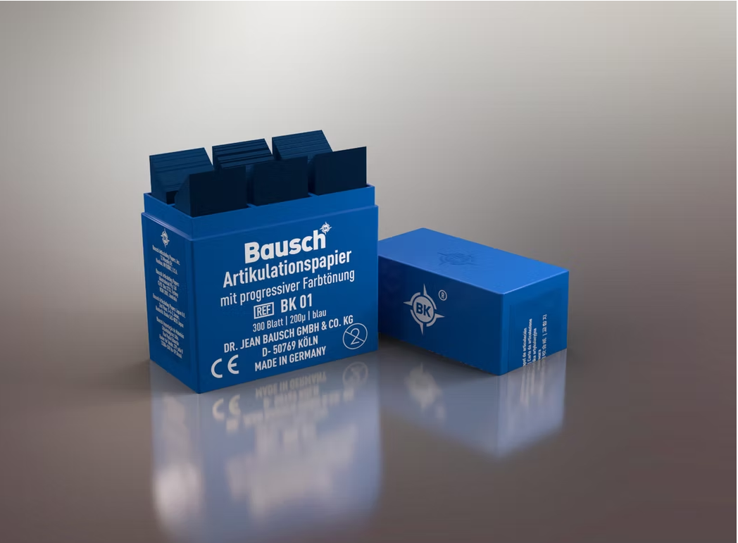 Giấy cắn Bausch 200µ với khả năng chuyển màu theo áp lực là công cụ lý tưởng để phát hiện rõ ràng bất kỳ nhiễu cản nào trong lực nhai. Sau khi đã điều chỉnh và định vị vùng có vấn đề, nên sử dụng các