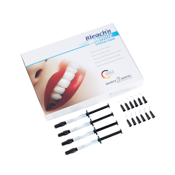 Bộ bổ sung cho hệ thống tẩy trắng răng Bleach’n Smile của bạn, Tẩy trắng răng Bleach’n Smile Dental Dam, 4 x 1,5g” là một sản phẩm đê cao su chuyên dụng được sử dụng trong quá trình tẩy trắng răng tại phòng khám nha khoa. Bộ sản phẩm chứa 4 ống tiêm Dental Dam để bảo vệ nướu an toàn.
