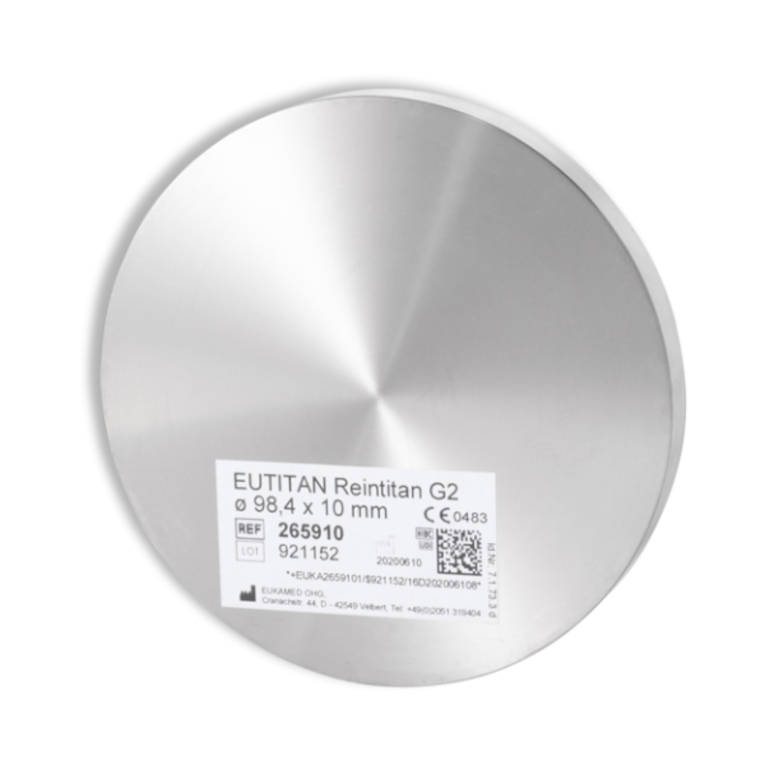 Titanium nguyên chất EUTITAN là vật liệu chất lượng cao để sản xuất phục hình răng, mão răng và cầu răng từ phôi phay CNC. Trong nhiều năm qua, vật liệu này đã kết hợp khả năng tương thích sinh học được biết đến và đánh giá cao với các đặc tính nhất quán mong muốn để sử dụng trong kỹ thuật nha khoa.